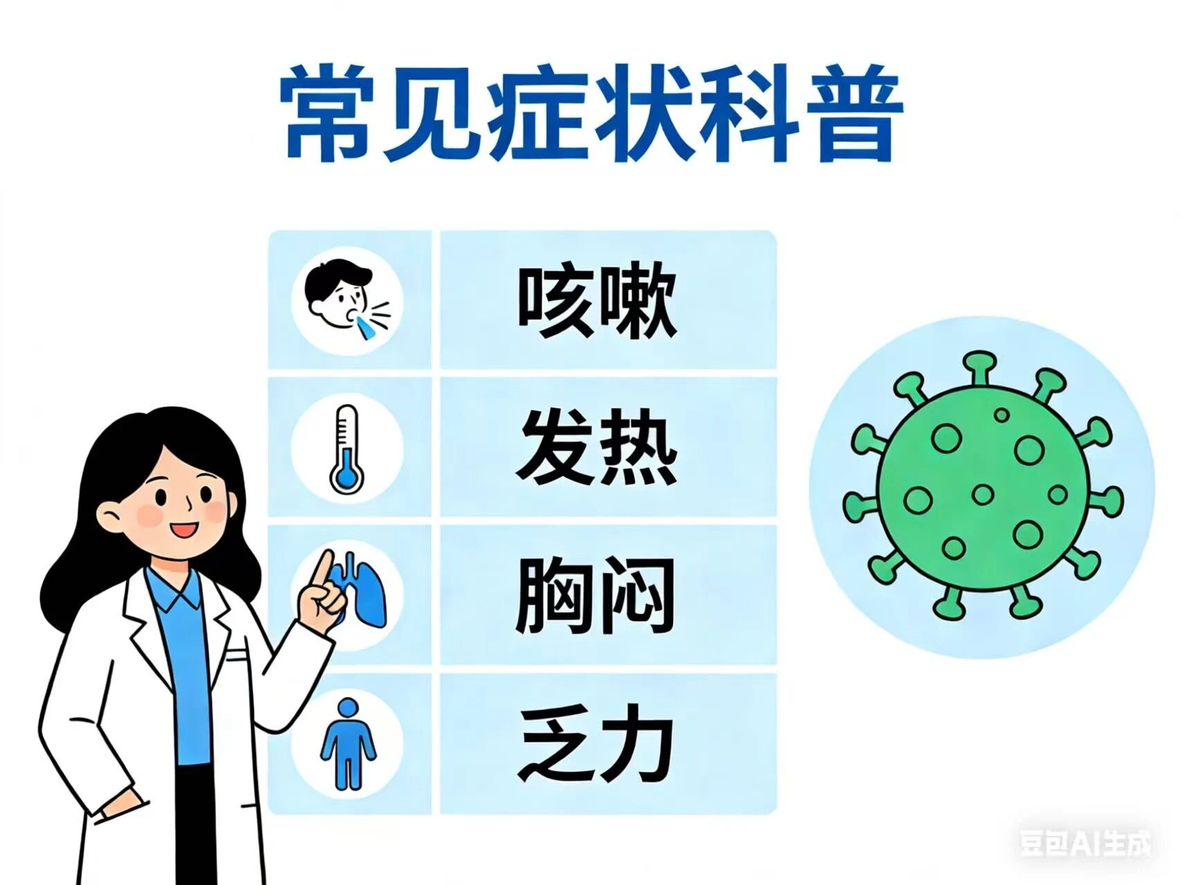 潜伏期:约2-10天,平均5-6天。初期:喉咙发痒、胸闷、干咳、低热。进展期(重症肺炎):突发寒战高热,体温超过39℃,伴有头痛、胸闷喘憋、呼吸困难、肌肉酸痛、极度乏力等表现,重症患者可出现意识障碍甚至昏迷。