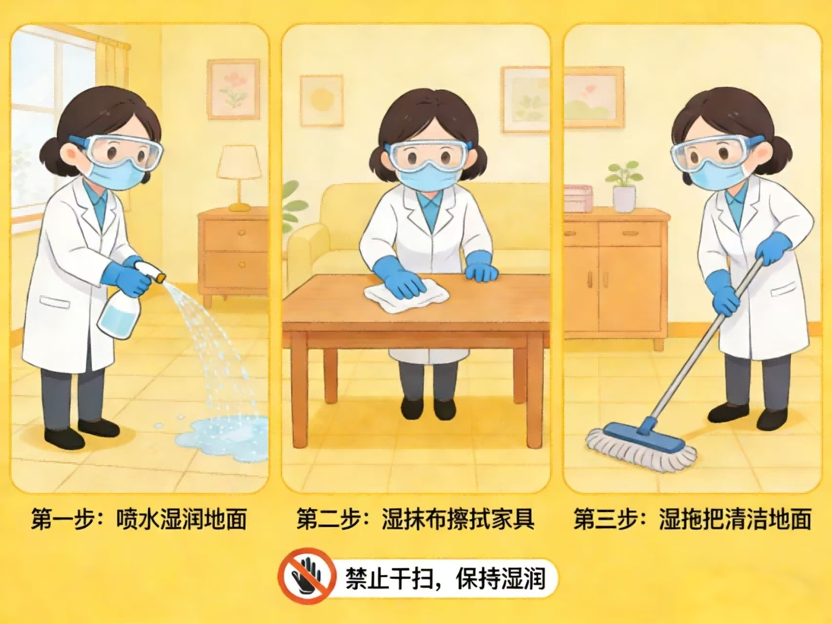 清扫过程:湿式清洁,绝对避免干扫,掸尘。先用喷壶湿润地面家具,在用湿抹布、拖把擦拭,减少扬尘。